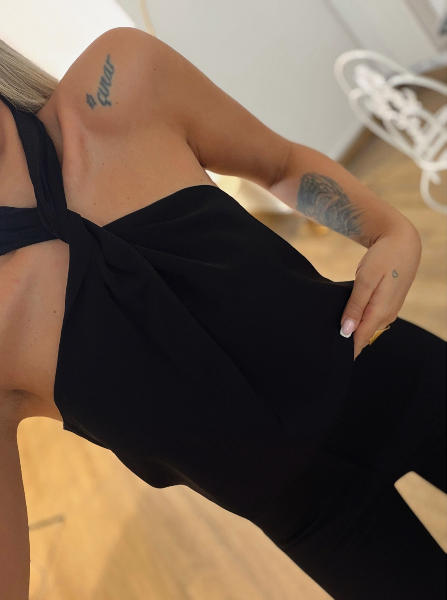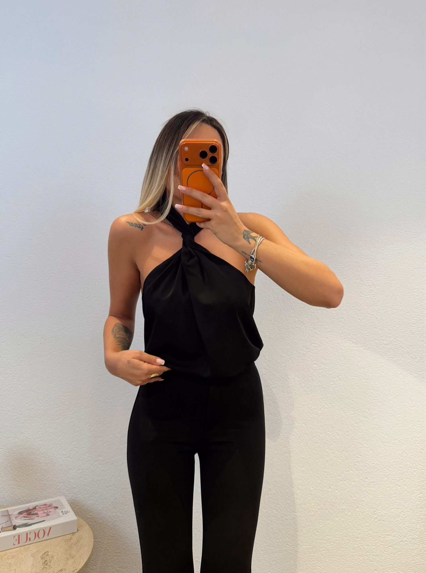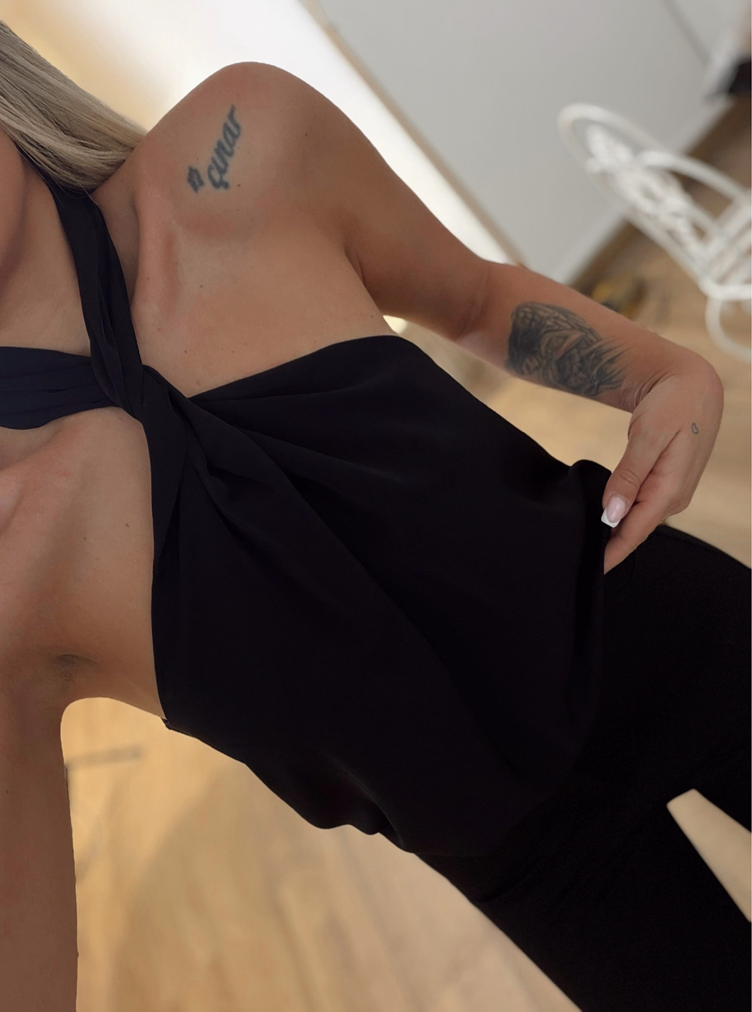 Çapraz Boyun Detay Saten Siyah Bluz