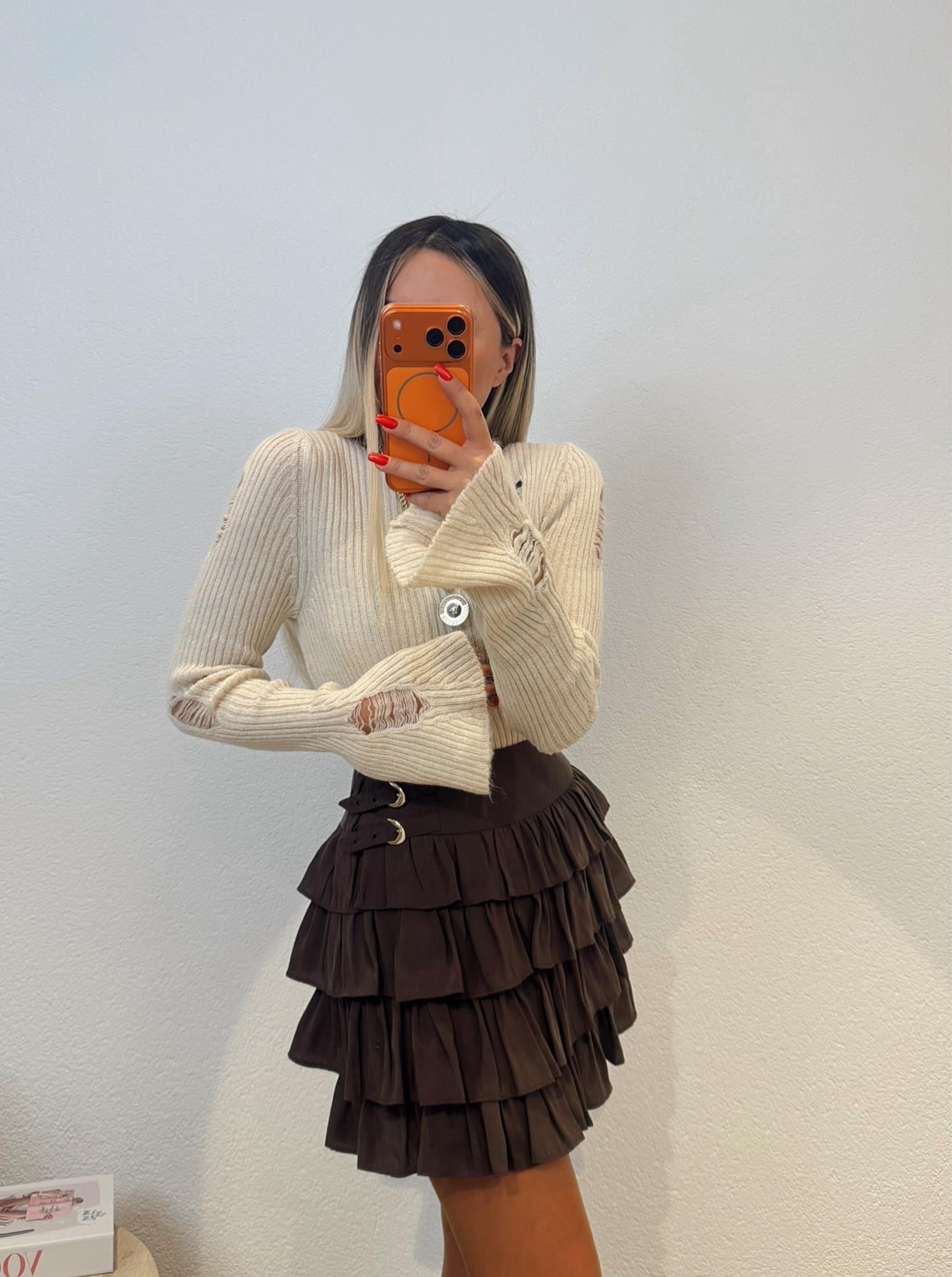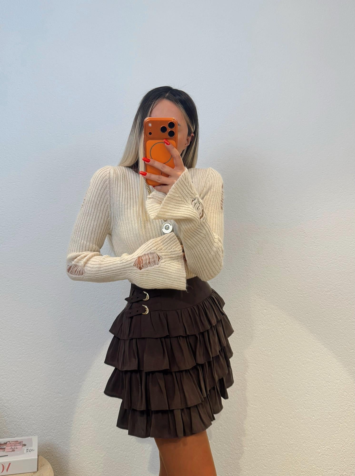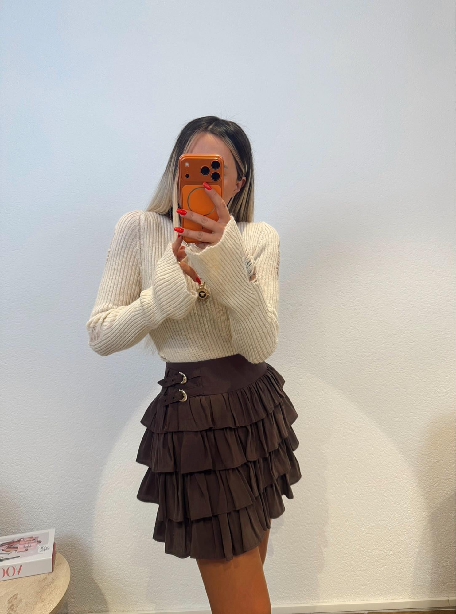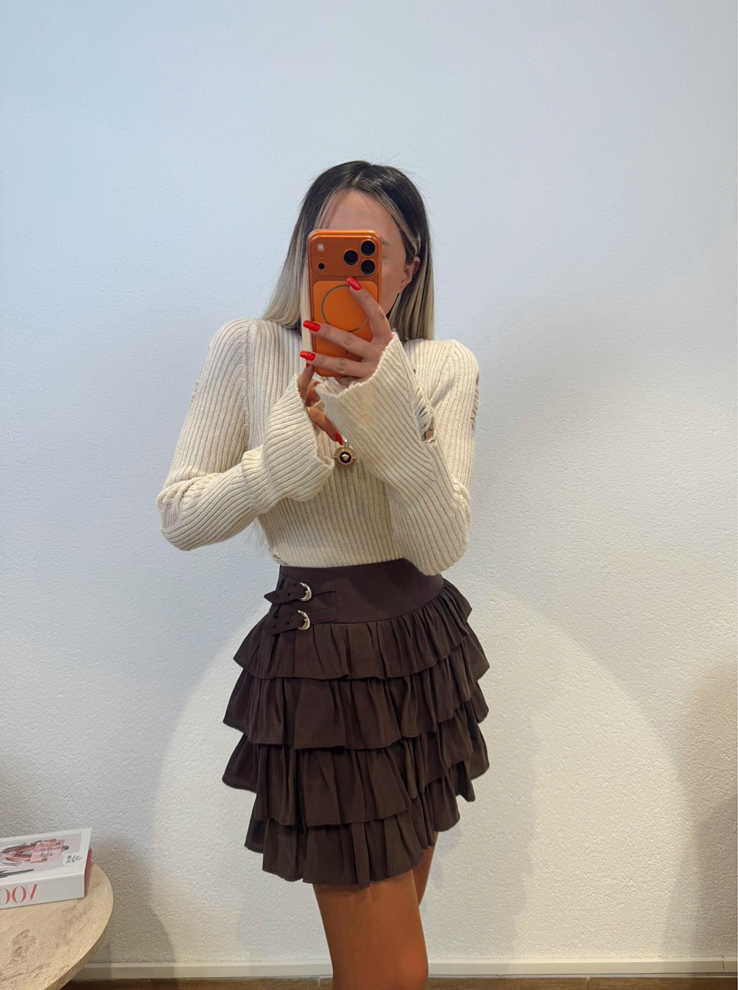 Bel Aksesuar Detay Katlı Mini Kahve Etek