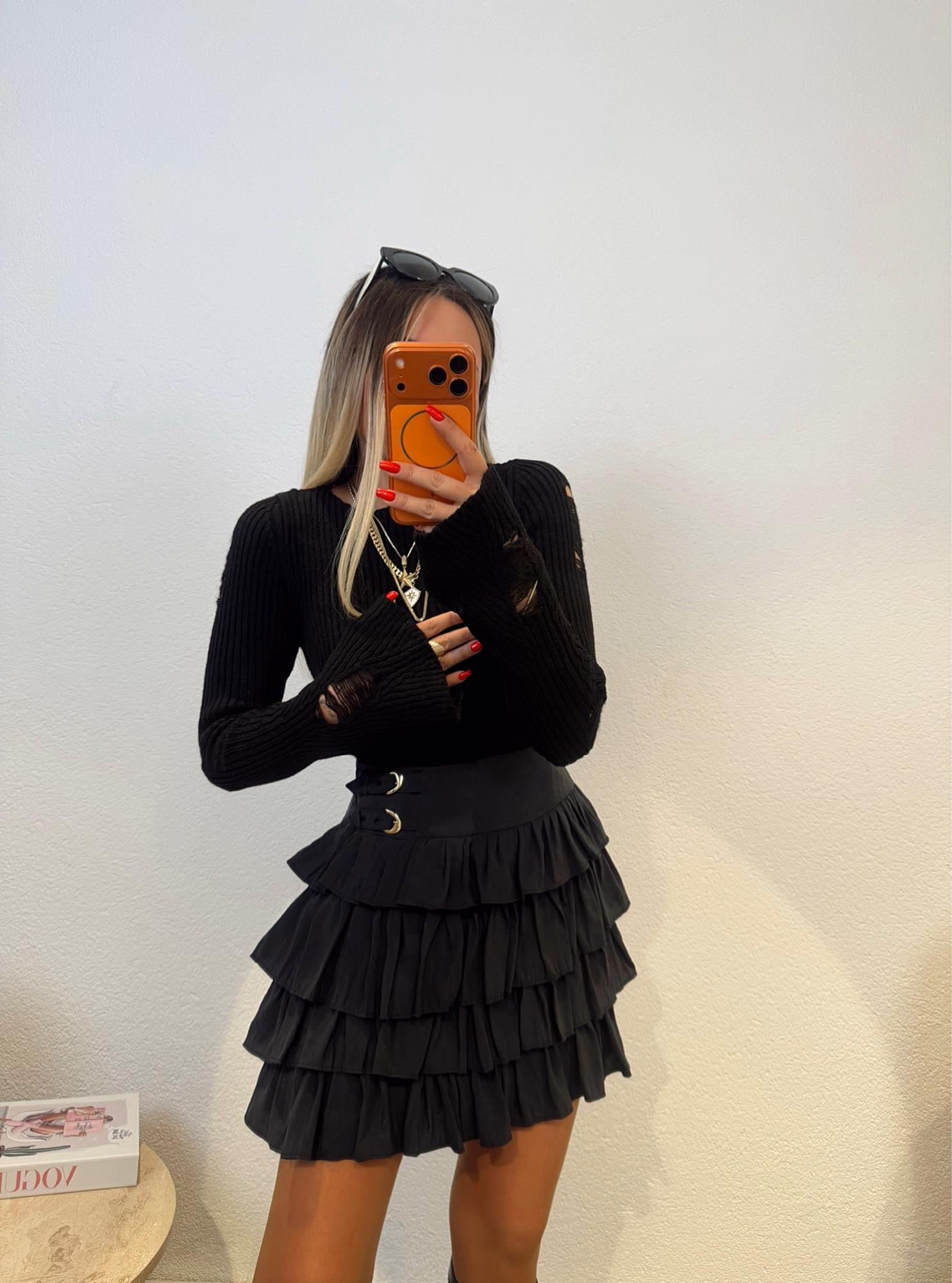 Bel Akseuar Detay Katlı Mini Siyah Etek