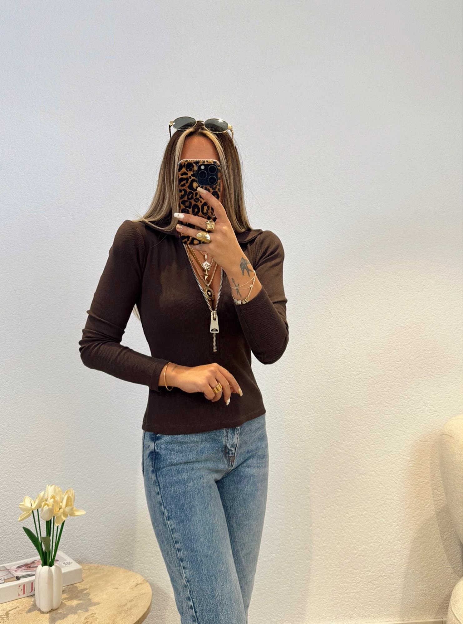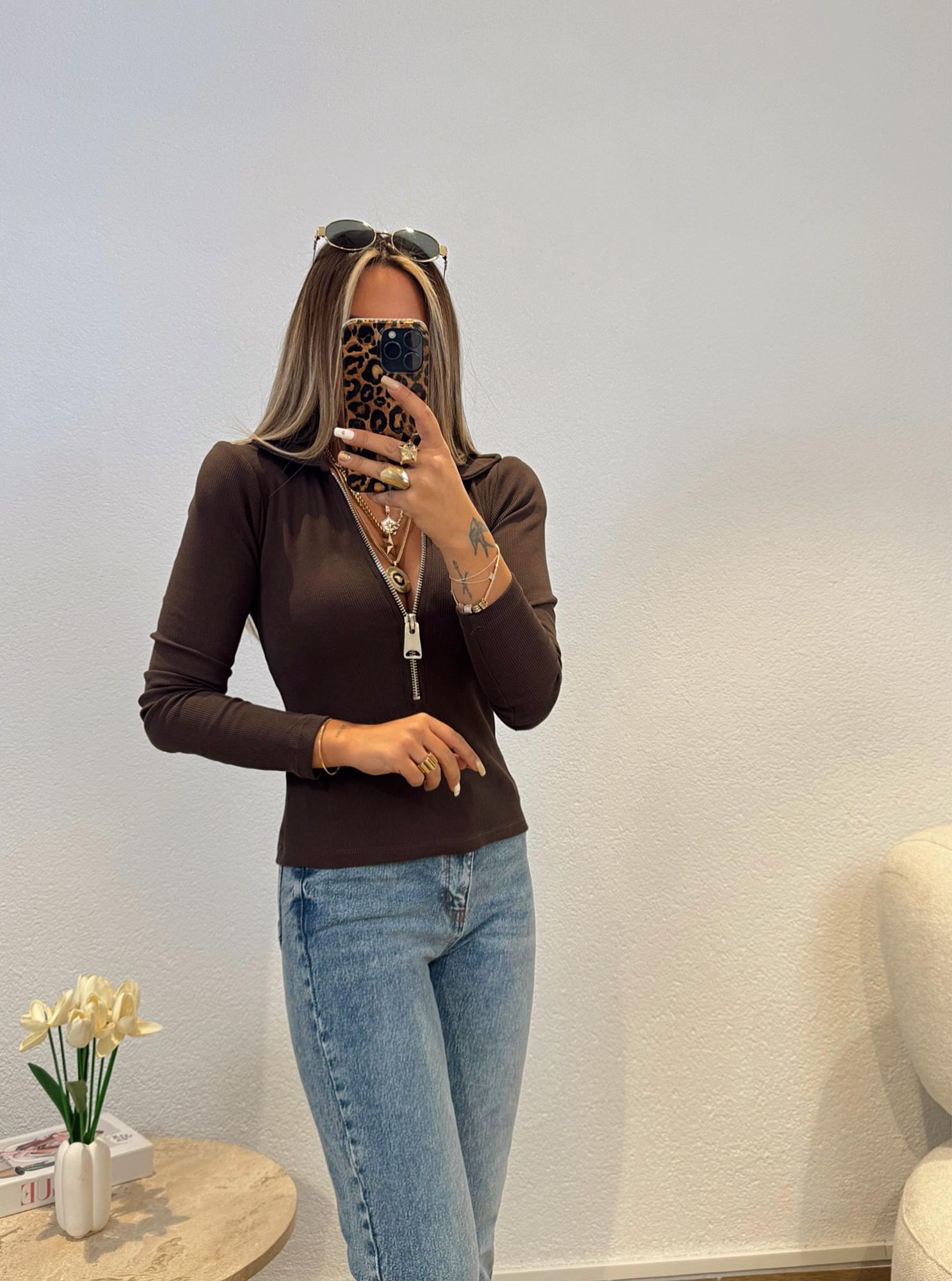 Polo Yaka Vatkalı Fermuarlı Kahve Badi