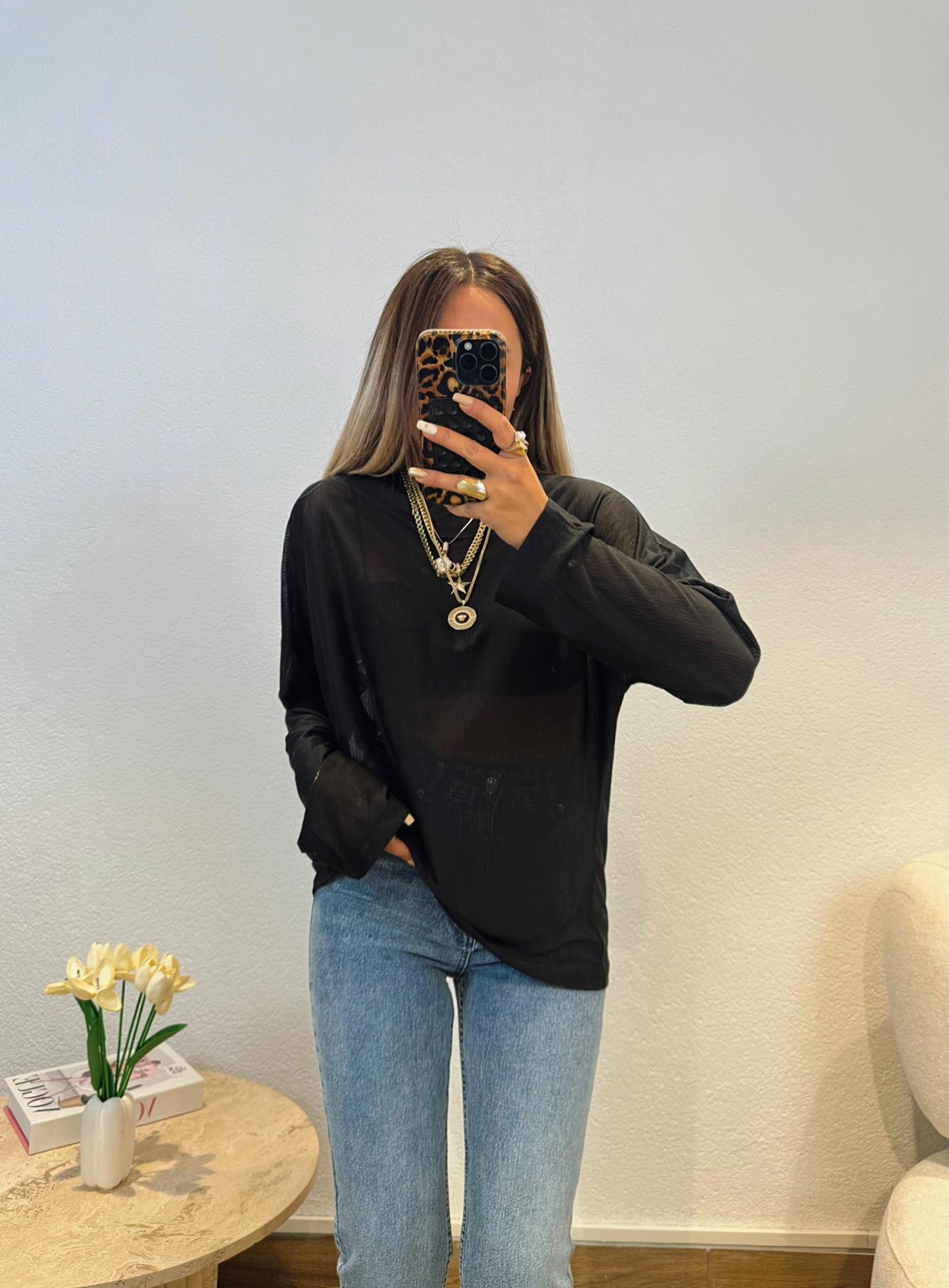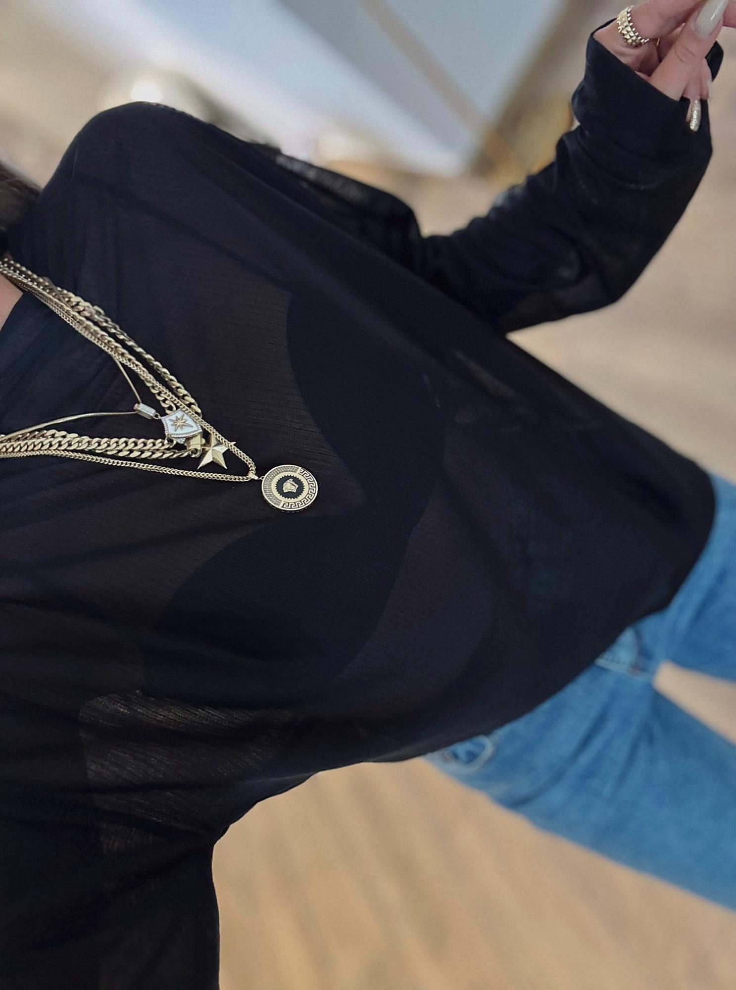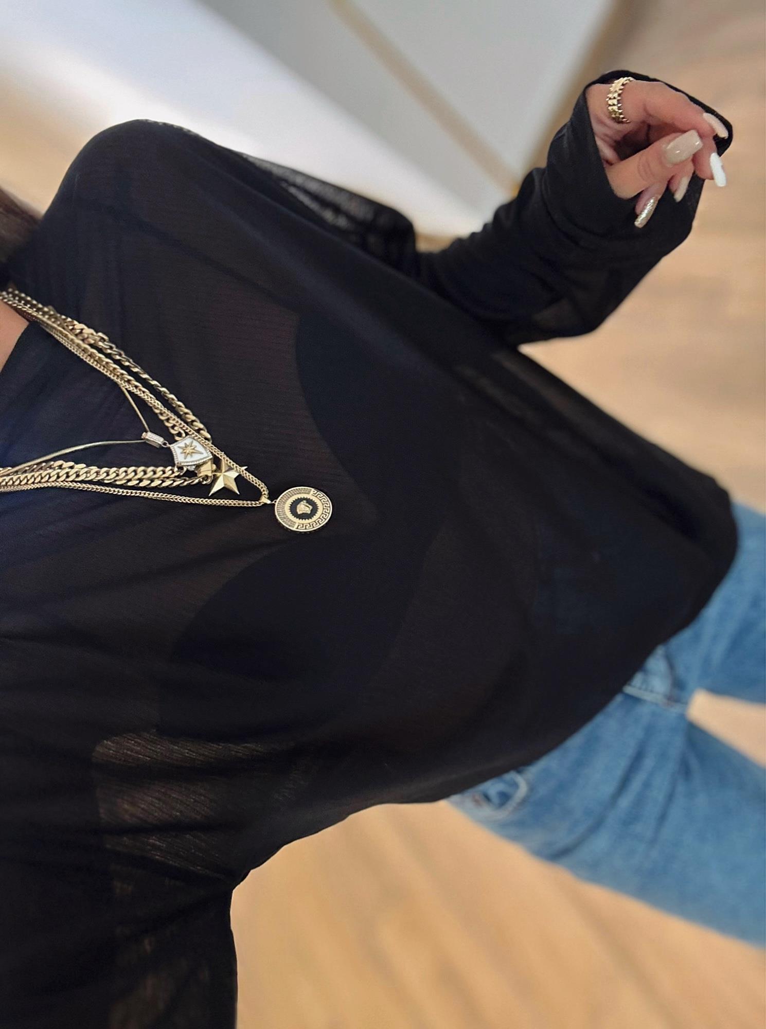 Transparan Dokulu Salaş İnce Siyah Triko